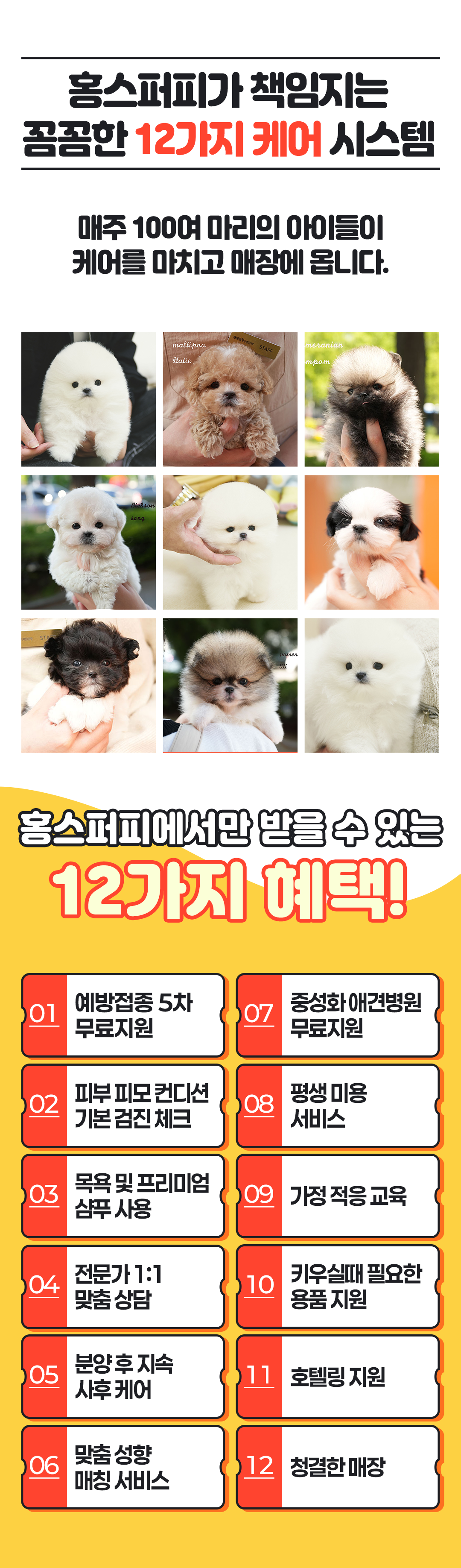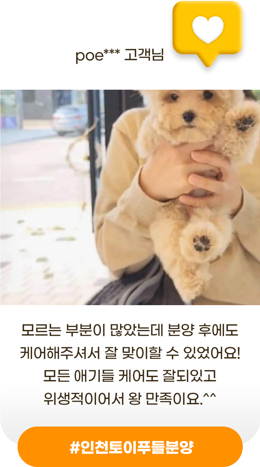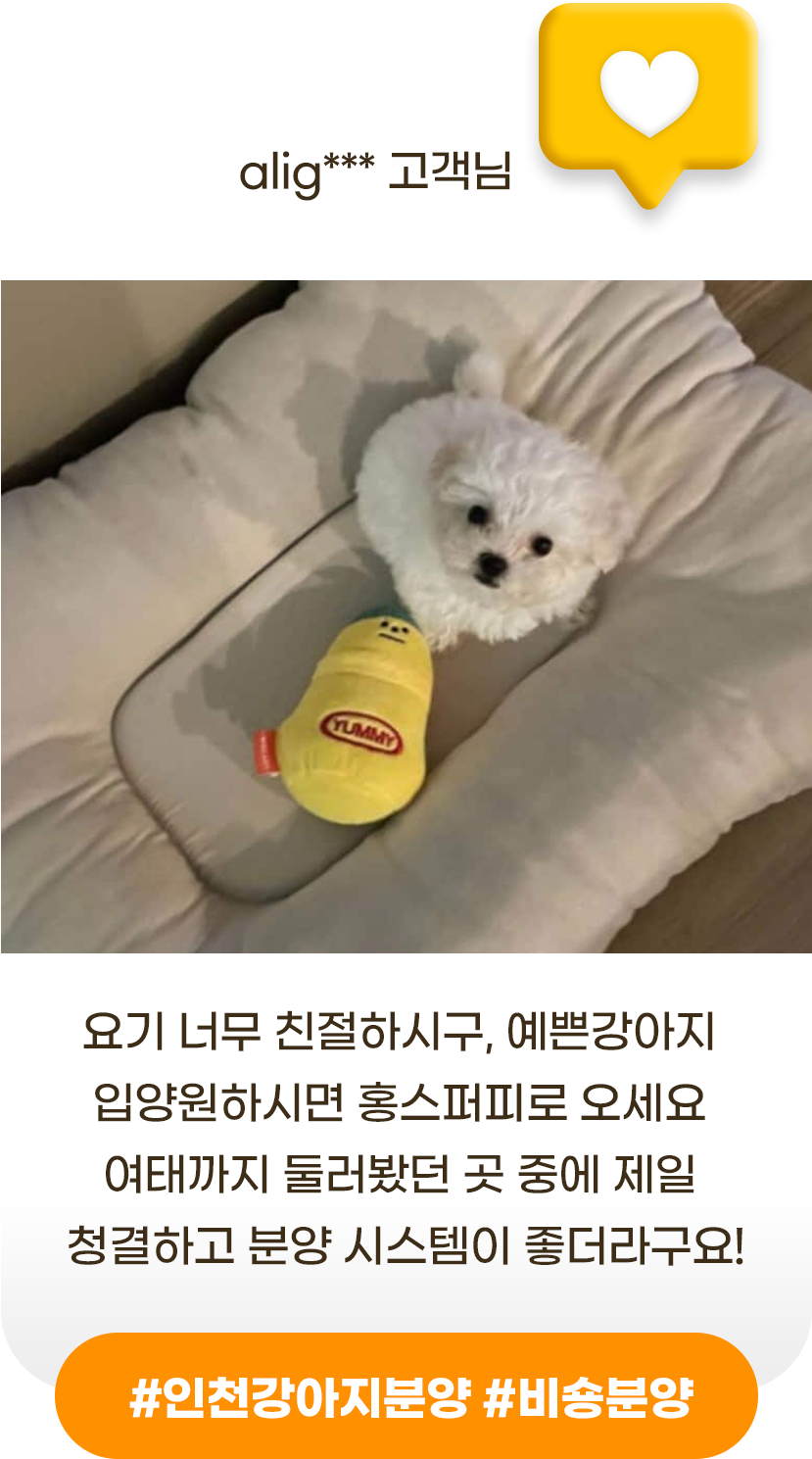 홍스퍼피 인천본점은 믿을 수 있는 분양과 평생 건강보장을 약속드립니다. 전문가의 꼼꼼한 케어를 거친 반려동물만을 분양하며, 입양 이후에도 따뜻한 사후관리 서비스를 제공합니다.
